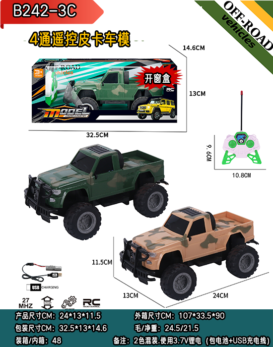 24 | B242-3C | 4通皮卡车模 | 16.2 | 48 | 开窗盒 | 21.5 | 2色混装.使用3.7V锂电(包电池+USB充电线) |