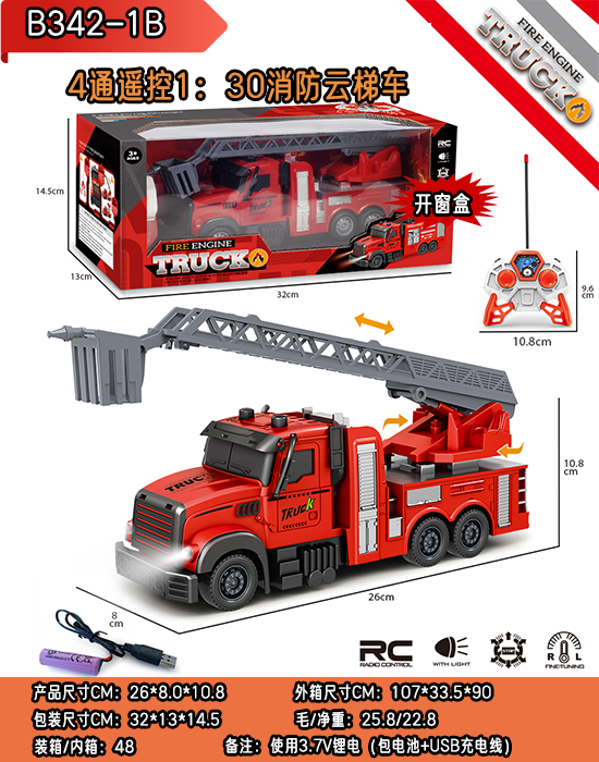 10A342-3B4通遥控1:30消防升降车22.848开窗盒20.8使用3.7V锂电(包电池+USB充电线)
