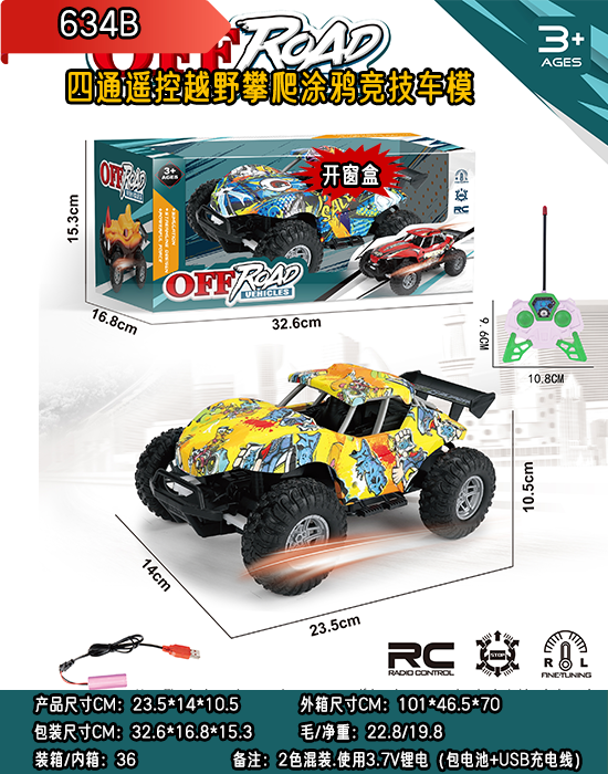 4 | 634B | 四通遥控越野攀爬涂鸦竞技车模 | 26.5 | 36 | 开窗盒 | 19.8 | 2色混装.使用3.7V锂电(包电池+USB充电线) |